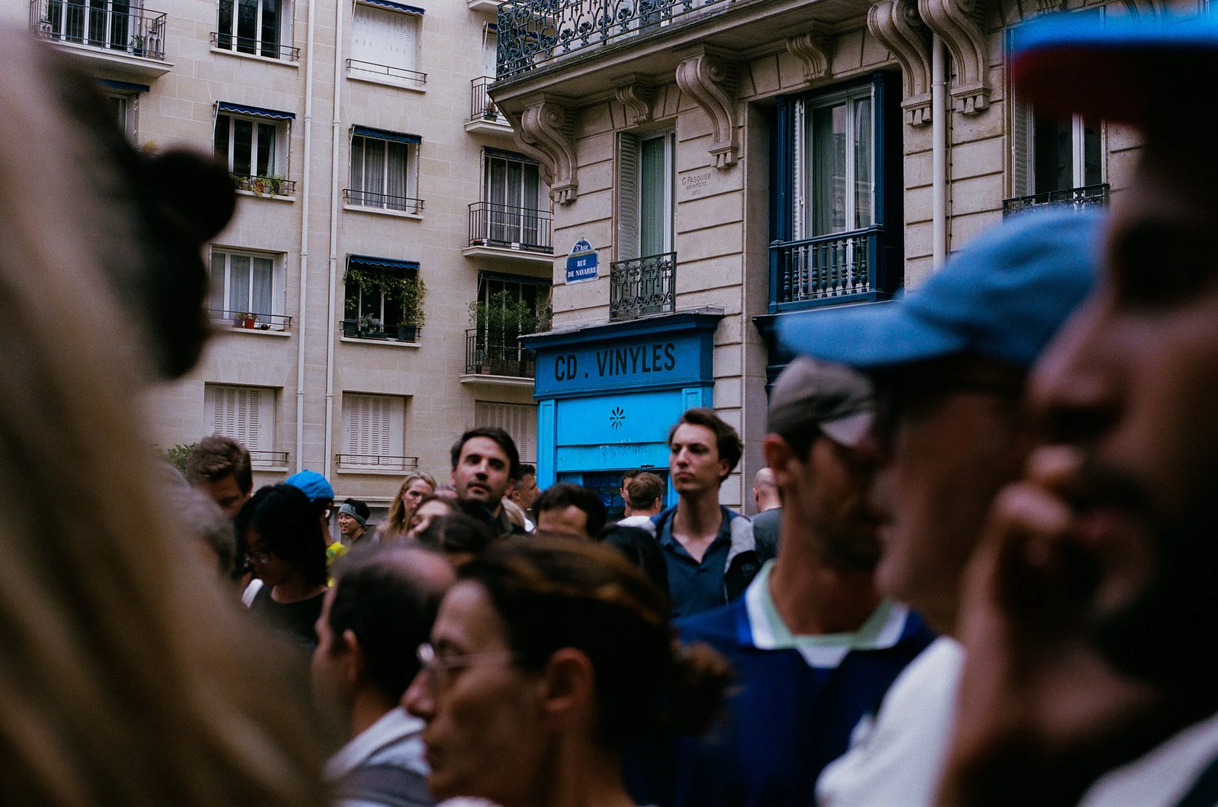 Parisians and tourists crowd intensely outside a 2024 Paris Summer Olympics venue.